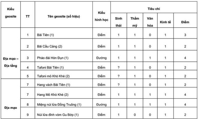 Việc đánh giá các giá trị khoa học và giá trị bổ sung geosite dựa vào các tiêu chí được Emmanuel Reynard đề xuất (Reynard 2008). Việc đánh giá sơ bộ các giá trị này dựa vào kết quả khảo sát thực địa và tham khảo ý kiến một số chuyên gia đã từng điều tra địa chất, địa mạo tại đảo Lý Sơn. Các geosite có sự hiện diện tiêu chí liên quan được cho điểm 1, nếu không có được cho điểm 0, các tiêu chí chưa đánh giá hoặc chưa rõ được đặt dấu ?. Điểm đánh giá giá trị khoa học và bổ sung geosite tại cù lao Ré và cù lao Bờ bãi được trình bày trong Bảng 1; 2; 3 và 4. Tóm tắt các giá trị khoa học và bổ sung geosite được trình bài trong bảng 5 và 6.