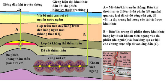 Trong các kiểu khai thác truyền thống, dầu khí được hình thành trong đá phiến (shale), đây là nhóm đá tạo thành trong ao hồ, đầm lầy, nền biển cạn… chứa nhiều vật liệu hữu cơ như rong tảo, mảnh vụn thực vật. Trong những điều kiện bị vùi lấp nhanh chóng và môi trường yếm khí sâu bên dưới, chúng sẽ chuyển hóa dần thành dầu và khí. Sau khi hình thành trong nhóm đá phiến, hay còn gọi là đá nguồn, với một tỷ trọng thấp hơn tỷ trọng các nhóm đá chung quanh, các phân tử dầu khí có khuynh hướng thoát ra khỏi đá nguồn và di chuyển lên trên về phía mặt ngoài vỏ đất qua các khe hở li ti của các nhóm đá có đặc tính thẩm thấu phía bên trên (đá cát, đá vôi…) hay còn gọi là đá chứa. Sự di chuyển lên trên của dầu khí sẽ bị chặn lại khi chúng gặp một nhóm đá không thẩm thấu (đá phiến, đá muối…) và dần dà tập trung nhiều hơn tại nơi đây, tạo thành các túi dầu khí với những cấu trúc khác nhau. Đây chính là nơi các mũi khoan nhắm đến để thu hoạch nguồn “vàng đen” từ thiên nhiên.