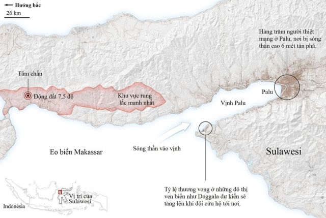 Trận động đất 7,5 độ xuất hiện vào chiều tối hôm 28/9 gây chấn động dọc theo vùng ven biển đảo Sulawesi, cách Palu khoảng 80 km về phía bắc. Theo một số nhân chứng, trong vòng 30 phút sau, những cơn sóng cao tới 6 mét đập vào bờ, phá hủy nhiều tòa nhà, đập nát xe cộ và giết chết hàng trăm người dân trong thành phố.