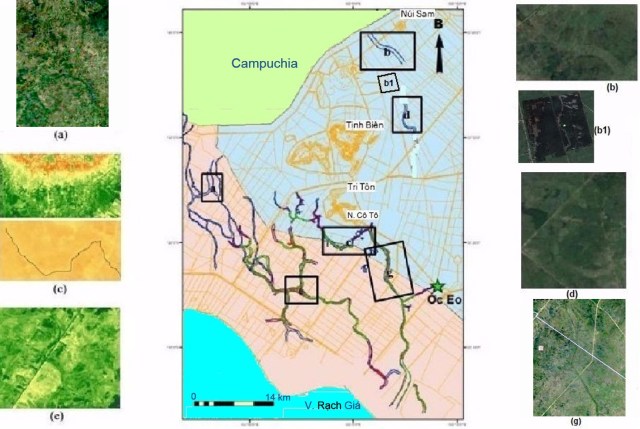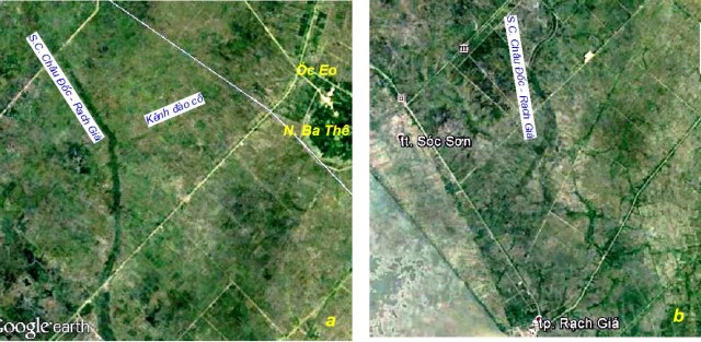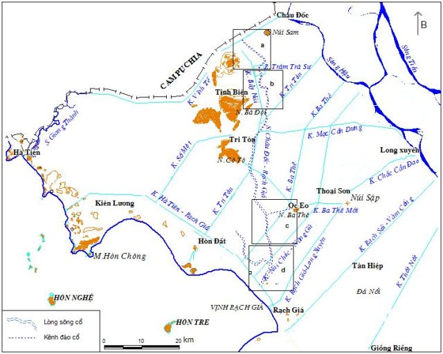 Sông cổ Châu Đốc – Rạch Giá: dòng chảy hướng bắc – nam nhận dạng được từ kênh Vĩnh Tế (phía tây nam Núi Sam 5,5 km) đến vịnh Rạch Giá gồm sông Đông Bảy Núi và Tây Óc Eo với điểm kết nối tại phía đông núi Cô Tô. Ảnh viễn thám từ năm 1984 đến nay rất khó nhận dạng sông Đông Bảy Núi đoạn từ đông bắc núi Bà Đội đến đông núi Cô Tô; trong khi đó trên bản đồ giải đoán (ảnh AF-68-15) của Nguyễn Huy Dũng (Hình 2), đoạn sông này được thể hiện khá rõ. Kết hợp bản đồ giải đoán hình 9 và hình 2, nhận được sông cổ Châu Đốc – Rạch Giá có đặc trưng sau: