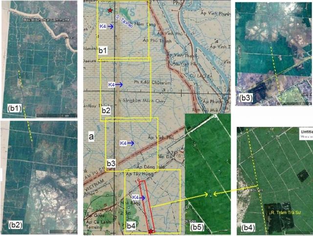 Bản đồ dấu vết kênh cổ khu vực Ankor Borei được thành lập bằng giải đoán ảnh hàng không (hình 3a, 3b) và điều tra thực địa sử dụng khoan tay cho kênh 1 và kênh 2 và rãnh đào ngang kênh 2, lấy mẫu phân tích tuổi chi tiết theo mặt cắt. Bản đồ này đã xác nhận sơ đồ của Paris (Hình 2a) nhưng cũng cho thấy dấu vết khác của kênh, đó là: “các kênh đào rất thẳng thường nối kết với hệ thống sông cổ (palaeochannel) như trường hợp kênh 2 và 3 từ Kampong Youl đến Angkor Borei qua hồ “móng ngựa” uốn khúc tại Phnom Angkor Borei.“[5].