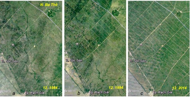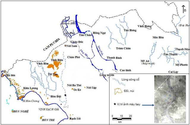 Năm 1994, trên bản đồ địa mạo thuộc Công trình bản đồ địa chất – khoáng sản Nhóm tờ đồng bằng Nam Bộ tỉ lệ 1:200.000, Nguyễn Huy Dũng và cộng sự đã thể hiện các dấu vết lòng sông cổ từ việc giải đoán ảnh hàng không loạt AF-68-15 do quân đội Mỹ chụp trong chiến tranh Việt Nam. Trên bản đồ này, dấu vết lòng sông cổ phân bố phổ biến ở khu vực Đồng Tháp Mười và khu vực An Giang – Kiên Giang (Hình 2). Sông cổ có dạng mạng, hướng chảy chủ yếu bắc – nam (từ Campuchia xuống). Ở Khu vực An Giang – Kiên Giang, lòng sông cổ dài nhất phân bố ở phía đông Bảy Núi và phía tây Óc Eo (dài khoảng 70 km) từ phía nam Núi Sam đến Vịnh Rạch Giá.