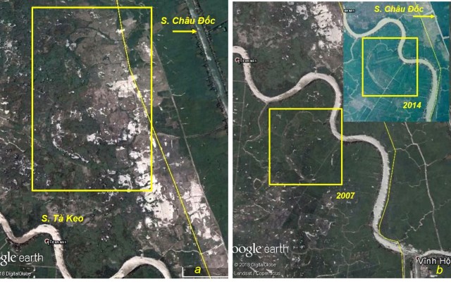 – Khu vực Tứ giác Long Xuyên đã từng có hệ thống dòng chảy từ Campuchia đổ vào. Kênh Vĩnh Tế đã cắt ngang hệ thống này dẫn đến hàng loạt các dòng (phân bố từ Châu Đốc đến sông Giang Thành) mất nguồn cấp, biến thành các lòng sông cổ.