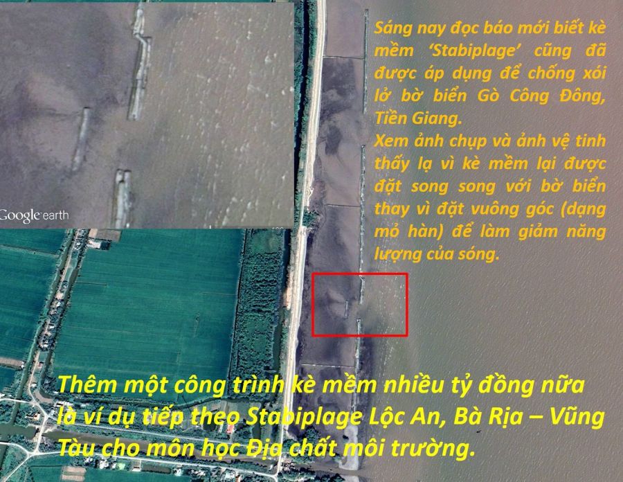 Kè mềm dọc theo biển Gò Công Đông thuộc dự án thí điểm “Gây bồi tạo bãi, trồng cây ngập mặn bảo vệ đê biển Gò Công Đông” bằng kết cấu vật liệu túi Geotube (sản xuất bằng vải dệt polypropylen) được may tại nhà máy thành các ống, sau đó bơm cát vào trong ống tạo thành các con đê mềm, hay còn gọi là đê ngầm.