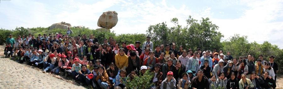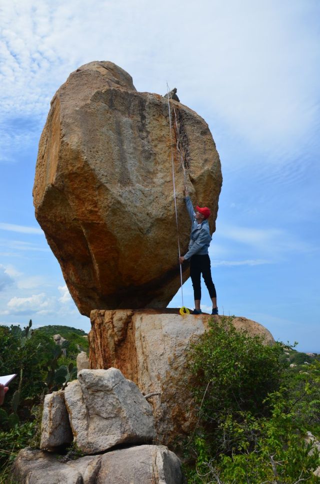 14:00 cả đoàn chụp ảnh kỉ niệm và nghe giảng tại khối đá biểu tượng cho Vườn QG Núi Chúa, khối đá còn có tên khác “Đá thần quyền”. Anh Hoàng Công Thành và thày Ngân dẫn đoàn vào Công viên Đá, một nhóm ở lại đo vẽ “Đá thần quyền”.