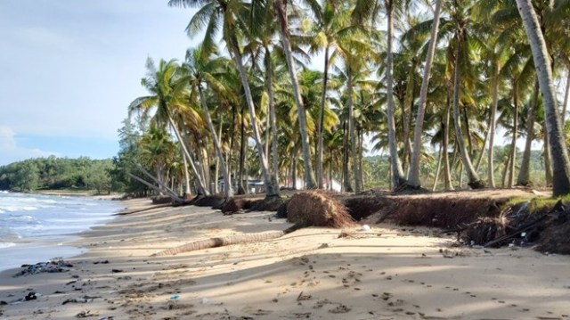Trên bờ biển, nhiều cây dừa cao to hơn chục mét nằm ngã sóng xoài trên bãi cát, gốc bị bật ngượi nằm hướng lên trên, một số nhà bị sóng đánh bật cả móng, tường nứt nhiều đoạn dài với vết nứt rộng đến nổi có thể thò tay vào.