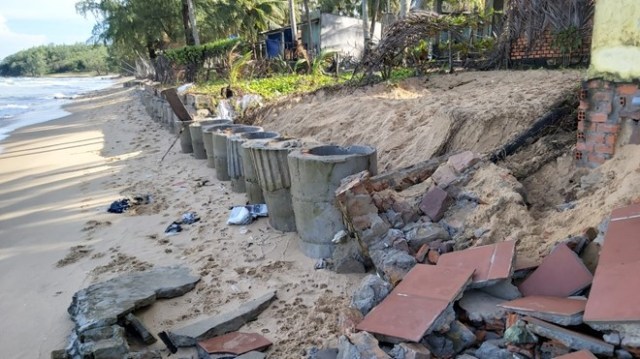 “Trước đây nhiều nhà dân có đất cất nhà ở cách bờ biển 50m, thế nhưng hiện giờ nhiều nhà đã phải bị rơi vào tình trạng sóng biển đánh đến tận vách”, bà Thuý nói.