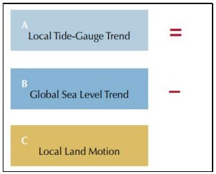 Để thiết lập một xu hướng đo thủy triều cục bộ (hộp A), không đơn giản và trực tiếp. Các xu hướng tuần hoàn, tín hiệu sự kiện và phân đoạn phải được xác định và loại trừ. Nhiều biến số khác nhau ảnh hưởng và can thiệp vào xu hướng dài hạn. Thông thường, không có xu hướng dài hạn, chỉ là các phân đoạn cần được xử lý riêng lẻ (như trường hợp kết quả đo thủy triều Bombay, được thảo luận bởi Mörner, 2010a). Các sự kiện ENSO (như sự kiện Super-ENSO) phải được loại trừ, như minh họa trong Hình 6 và được trình bày cho kết quả ở Tuvalu của Mörner (2007c, 2010b).