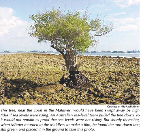 Các sự kiện thực sự phải được tìm thấy trong tự nhiên; chắc chắn không phải ở các bảng mô hình. Một số bản ghi có tính chất diễn giải Những người khác khá rõ ràng và thẳng thắn. Tôi thường tuyên bố rằng “cây cối không nói dối” (ví dụ trong Mörner 2007c), ám chỉ những cái cây cô đơn ở Maldives, biểu thị mực nước biển ổn định trong 50-60 năm qua (và do đó đã được kéo xuống bằng tay bởi một nhóm các “nhà khoa học” người Úc và những người hướng đạo sinh IPCC). Và những cái cây trên bãi biển ở Sundarban, cho thấy sự xói mòn mạnh mẽ nhưng mực nước biển không dâng (Mörner 2007c, 2010a). Bằng cách này, tôi hy vọng, chúng ta có thể giải phóng thế giới khỏi cuộc khủng hoảng nhân tạo, vốn đã bị IPCC và các trinh sát viên của tổ chức này lên án về tình trạng ngập lụt trên diện rộng và thảm khốc trong tương lai gần. Đây là mối đe dọa chính trong kịch bản IPCC, và bây giờ nó đã biến mất.