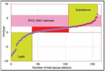 Hình 4 cho thấy các giá trị của 159 trạm đo thủy triều của NOAA chỉ ra rằng chúng nằm trong khoảng từ khu vực nâng lên đến khu vực sụt lún (khu vực xanh). Nếu loại trừ các vị trí nâng lên và sụt lún (khu vực xanh), chúng ta chỉ còn lại một số địa điểm (khu vực màu đỏ) nơi mực nước biển dâng trong khoảng 0,0 đến 2,0 mm / năm. Con số này thấp hơn đáng kể so với tỷ lệ do IPCC đưa ra (vùng màu hồng) và đo độ cao vệ tinh (như thảo luận bên dưới).