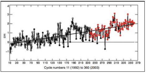 Hình 7 cho thấy kết quả đo độ cao từ vệ tinh được thể hiện với màu đen là TOPEX/POSEIDON và Jason là màu đỏ. Như được trình bày vào năm 2003 (Aviso 2003), đột nhiên có một xu hướng mới thể hiện tốc độ gia tăng mực nước biển là 2,3 (± 0,1) mm/năm. Điều này có nghĩa là các kết quả đo ban đầu được trình bày trong Hình 5 và 6 hiện đã bị nghiêng đi 2,3 mm/năm. Bây giờ chúng ta phải hỏi: Sự nghiêng này đến từ đâu?