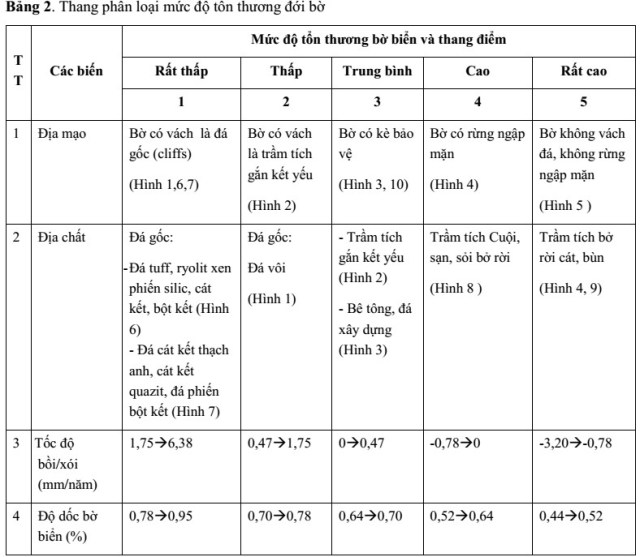 Yếu tố địa mạo được phân chia làm 5 cấp, mô tả mối liên quan giữa đặc điểm hình thái các vách bờ và mức độ xói lở. Thang phân chia được tính điểm từ 1 đến 5 theo mức độ gia tăng sự tổn thương đới bờ đối với hiện tượng nước biển dâng. Trong nghiên cứu này, yếu tố địa mạo chủ yếu dựa vào khảo sát thực địa. Các phân cấp trong thang phân loại tổn thương được trình bày chi tiết ở bảng 2.